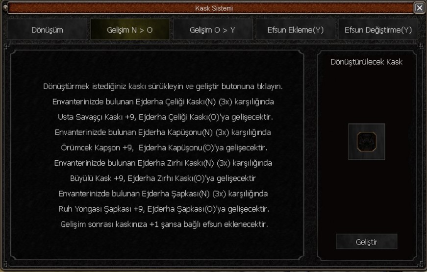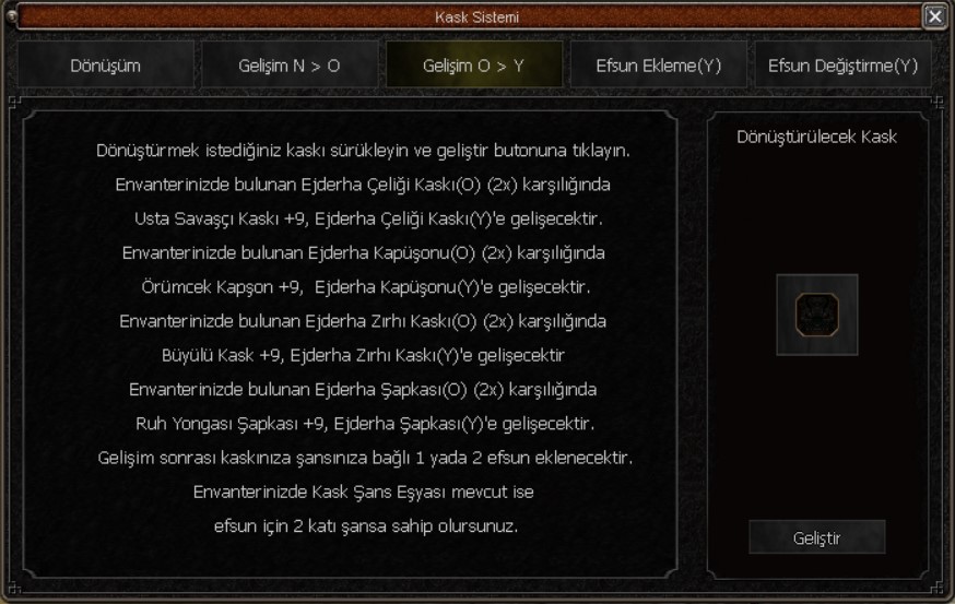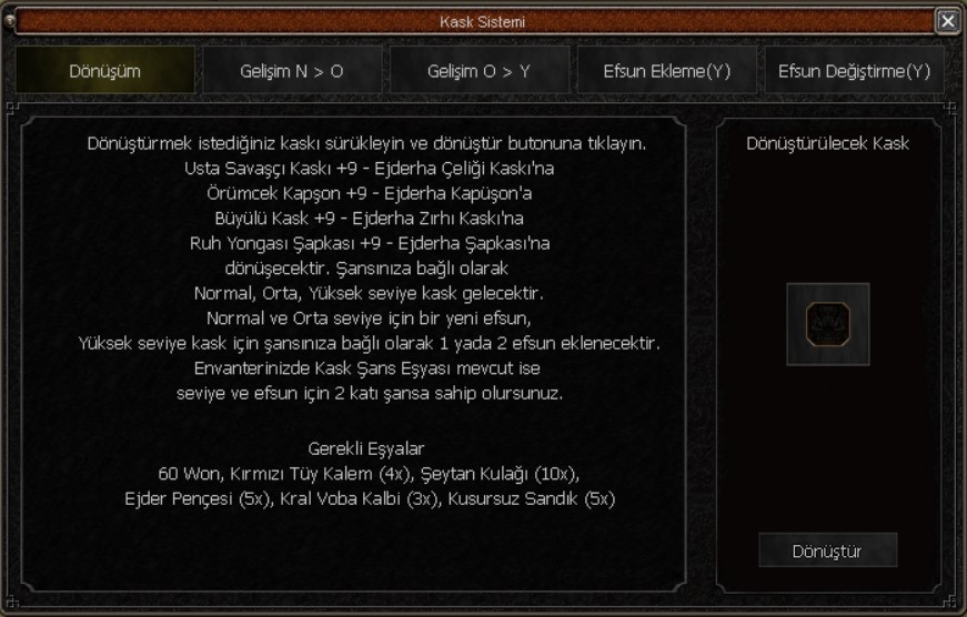 Kask Sisteminde kullanılabilen Usta Savaşçı Kaskı, Örümcek Kapşon, Büyülü Kask, Ruh Yongası Şapkası eşyalarınızı dönüştürebilirsiniz. Dönüşüm sonrası şansınıza bağlı olarak Normal, Orta, Yüksek seviye bir kaska sahip olursunuz.