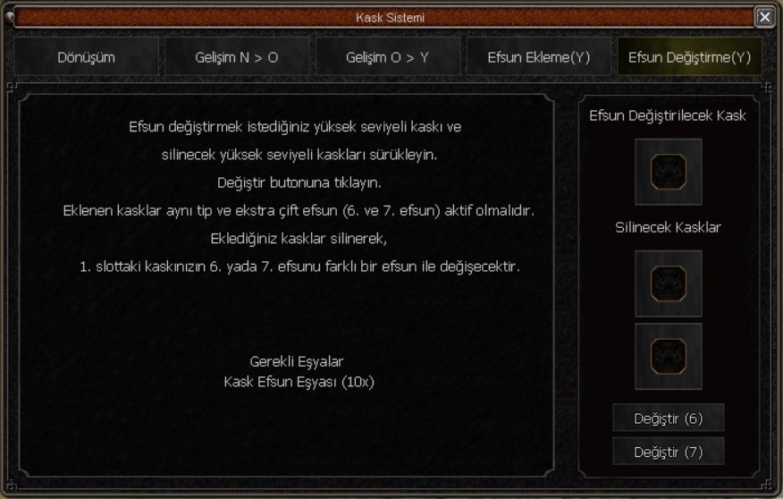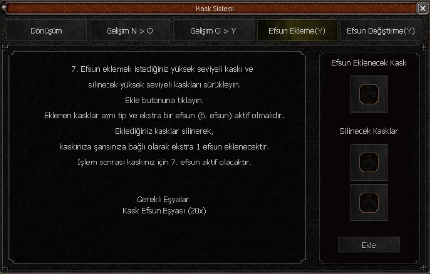 Efsunlar istediğiniz gibi gelmedi mi ozaman değiştir! Artık ekstra çift efsunlu kasklarınızın 6. yada 7. efsununu değiştirebilirsiniz. 2 adet aynı tip ve çift ekstra efsunlu kaskınızı silerek belirlemiş olduğunuz çift efsunlu bir kaskın 6. ya da 7. efsununu değiştirebilirsiniz. Mevcut efsun tekrar gelmez farklı bir efsun elde edeceksiniz. 1. Efsunda güç efsunları için 20, savunma efsunları için 10 gelir. 2. Efsunda güç efsunları için 10, savunma efsunları için 5 gelir. Gerekli Kask Efsun Eşyasını Kusursuz Sandık açarak elde edebilirsiniz.